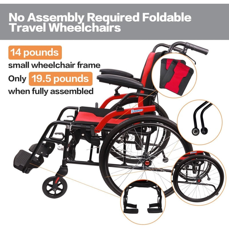 【Magnesium ultra lightweight wheelchair】Extended seat:20"W x 16"D seat,Overall dimensions: 43.3"(L) x 26.5"(W) x 37.8"(H),Pnomsp wheelchair is come with cushion and weighs only 14 lbs,The total weight after installing the two rear wheels is 19.5 lbs,Magnesium alloy frame,shigh strength, light weight, the color of the frame is black and red, unique design, very slap-up.